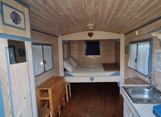 Avec son esprit inspiré du monde marin, la roulotte familiale goélette est un hébergement insolite à Oléron Marennes idéal pour un séjour en famille jusqu’à 4 personnes. Elle dispose d’un lit double pour les parents et d’une chambre séparée avec lits superposés pour les enfants, permettant à chacun d’avoir son espace tout en partageant des moments ensemble.